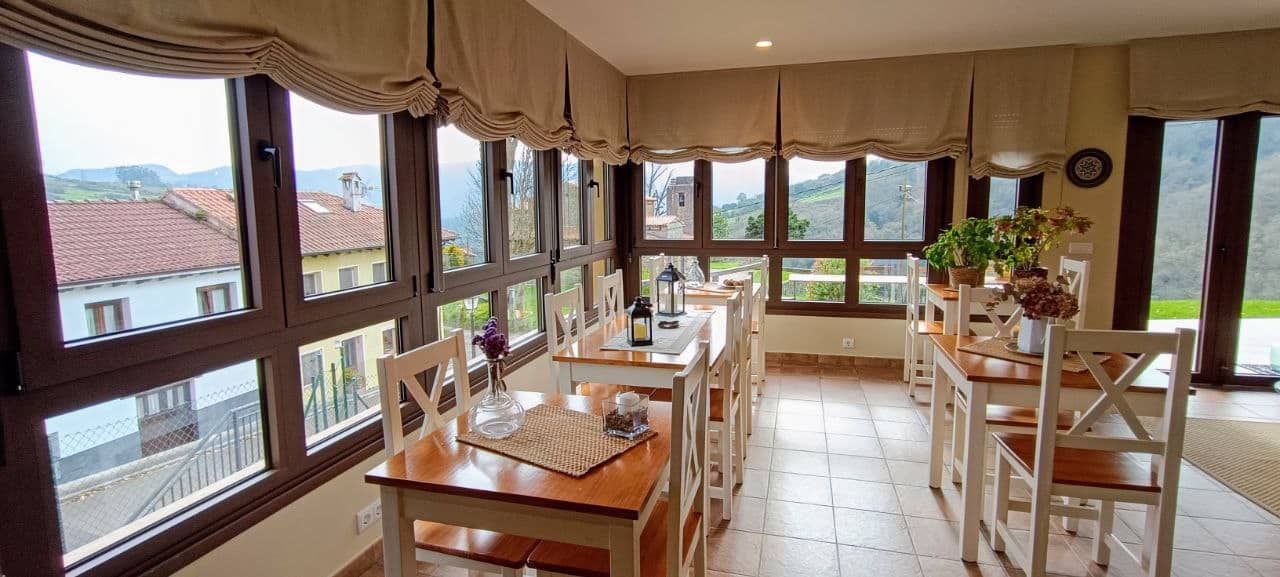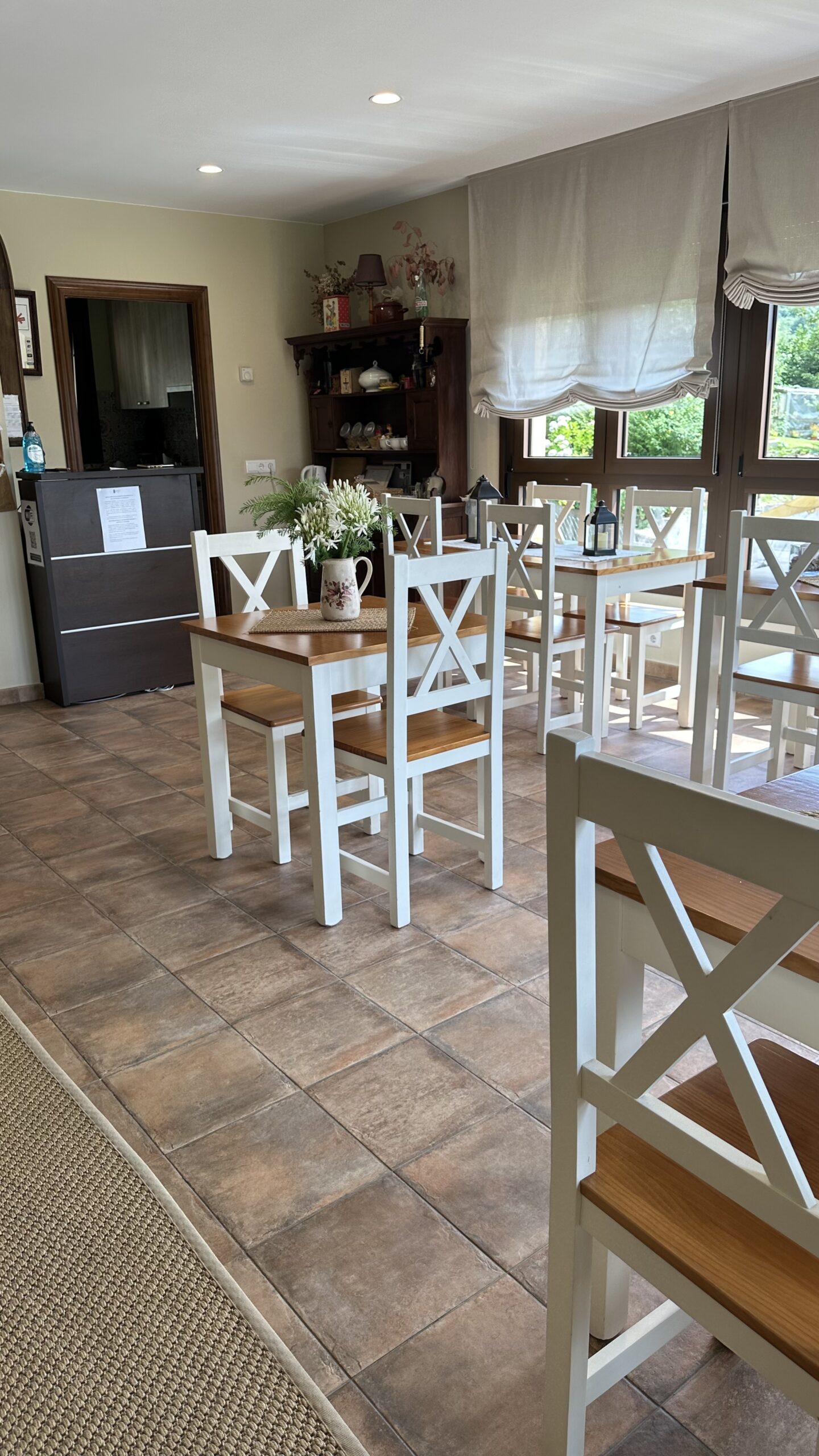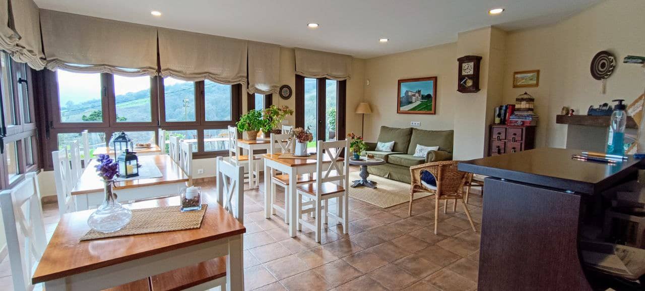 Un amplio salón donde los huéspedes pueden desayunar y cenar, además de cocina, recepción, plazas de aparcamiento y cargador privado de coches eléctricos.